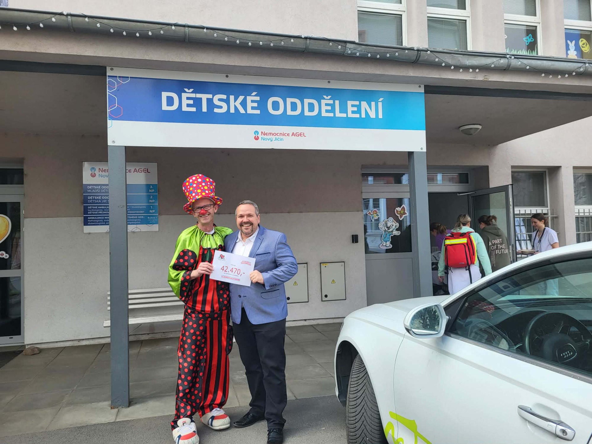 Dnešní návštěva nemocnice Nový Jičín byla spojena s příjemným setkáním. Aleš Demel šéf Spolku Horní Dolní předal Klaunům z Balónkova šek na částku 42.470,-Kč na podporu projektu KLAUNOSANATORIUM. Moc díky jsou to borci......